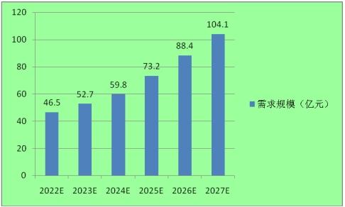 圖表:2022-2027年軍工線纜市場需求規模預測(億元)