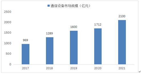 根據工信部數據統計,通信設備行業呈現逐年增長趨勢,受疫情影響增長趨勢有所放緩,2021年通信設備行業市場規模為2100億元,較2017年增長116.7%。