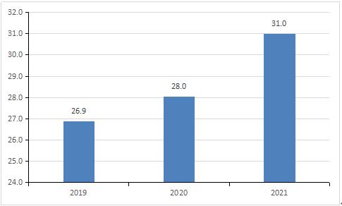 2021年疫情得到控制后,為了刺激經濟,中央財政開始投入資金進行相關基礎設施建設,建筑施工行業的資產規模開始增長。截至2021年末,全國建筑施工業企業資產總計達到31.0萬億元。較2020年同比提高了10.60%。