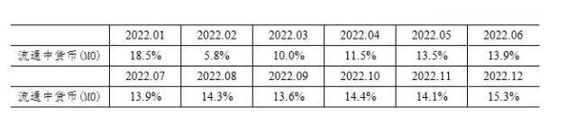 自2022年12月起,“流通中貨幣(M0)”含流通中數字人民幣。12月末流通中數字人民幣余額為136.1億元。修訂后,2022年各月末M1、M2增速無明顯變化。修訂后M0增速如下: