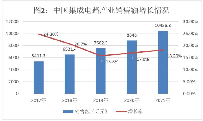 中國集成電路產(chǎn)業(yè)首次突破萬億元。中國半導體行業(yè)協(xié)會統(tǒng)計,2021年中國集成電路產(chǎn)業(yè)銷售額為10458.3億元,同比增長18.2%。其中,設計業(yè)銷售額為4519億元,同比增長19.6%;制造業(yè)銷售額為3176.3億元,同比增長24.1%;封裝測試業(yè)銷售額2763億元,同比增長10.1%。