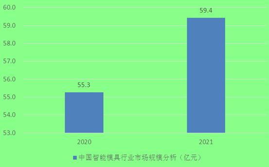 中國智能模具行業市場規模在2020年達到了55.3億元,2021年市場規模達到了59.4億元。