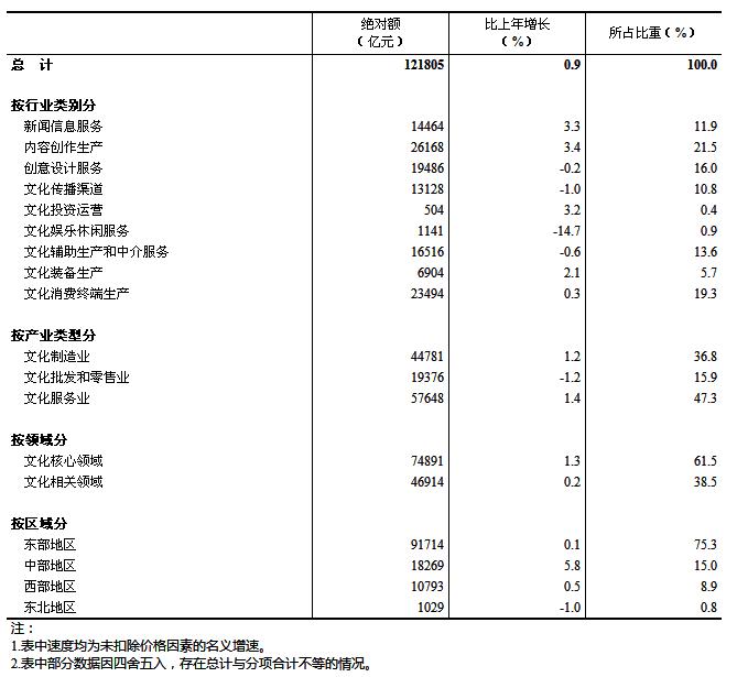 分領域看,文化核心領域[3]營業收入74891億元,比上年增長1.3%;文化相關領域46914億元,增長0.2%。