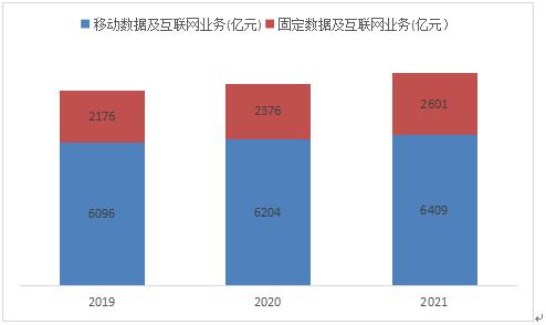2021年,固定數據及互聯網業務實現收入2601億元,比上年增長9.3%,在電信業務收入中占比由上年的17.4%提升至17.8%;移動數據及互聯網業務實現收入6409億元,比上年增長3.3%。