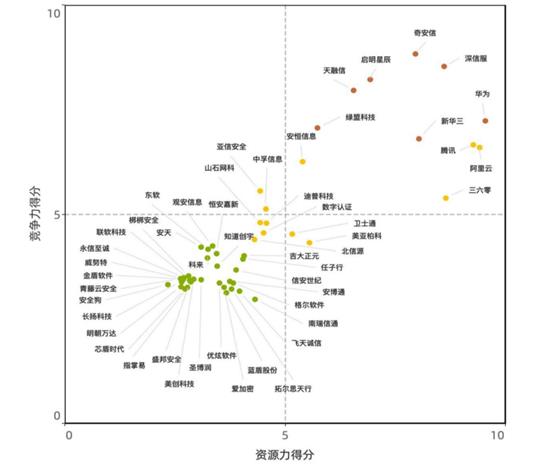 從整體來看,右上角頭部企業競爭格局變化不大,頭部企業在網絡安全領域運營多年,有較強的競爭壁壘。但是廠商之間的競爭依然較激烈。奇安信借助強大的資本與資源的投入迅速成為領導者頭部廠商。另外,可以看到頭部企業與左下角的與中小型廠商進一步拉開差距。安恒信息、中孚信息憑借良好的業績表現,競爭力顯著提升。IT龍頭企業與互聯網公司不斷加大安全領域的投入,進入網絡安全市場,競爭力也有明顯提升。