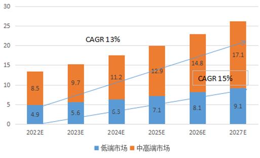 2022-2027年,隨著我國居民的可支配收入增加,繼而對優質醫療服務的需求增加,而公立醫院因受政府監管而無法提供具競爭力的服務。例如,根據《國務院辦公廳關于城市公立醫院綜合改革試點的指導意見》,公立醫院特需醫療服務的比例不得超過全部醫療服務的10%。相比而言,私立醫院在服務定制和定價方面更加寬松。未來隨著行業進一步得到發展,預計2022-2027年我國民營兒科醫院行業將以13%的年復合增長率保持較快增長,預計至2027年我國民營兒科醫院行業中高端市場規模有望增長至為17.1億元,低端市場有望增長至9.1億元。