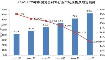 圖表:2021-2025年碳碳復(fù)合材料行業(yè)市場規(guī)模及增速預(yù)測