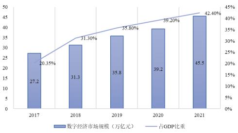 2021年我國數字經濟規模達到45.4萬億元,占GDP比重達到39.8%,數字經濟在國民經濟中的地位更加穩固、支撐作用更加明顯。