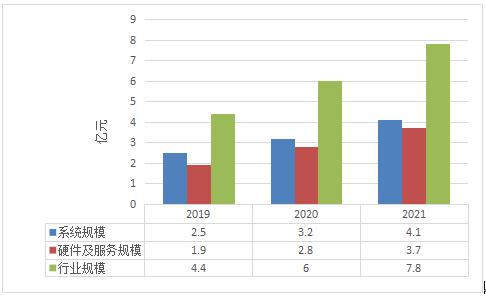 相關數據顯示,2014年國內反無人機行業總產值約0.91億元,到2021年行業總產值在7.8億元左右,其中反無人機系統市場規模為4.1億元,反無人機硬件及服務市場規模達到3.7億元左右。