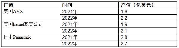 2022年美國AVX、美國kemet基美公司、日本Panasonic鉭電容器產值分別為2.2、2.1、2.7億美元。
