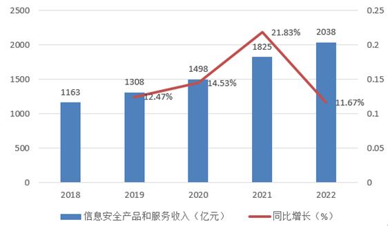 信息安全產業是支撐和保障國家信息安全的重要基礎,肩負著為國家信息化基礎設施和信息系統安全保障提供安全產品及服務的戰略任務。傳統的依賴于邊界防御的靜態安全控制措施將逐漸被基于大數據分析的高級、智能安全手段所取代。據工信部數據,2022年,信息安全產品和服務