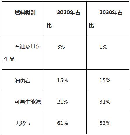 表2:2020年和2030年不同燃料占發電總量比重