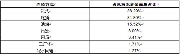 從養殖方式來看,海水養殖可以分為池塘、筏式、普通網箱、深水網箱、吊籠、底播、工廠化等多種方式,而這七種養殖方式所用面積的結構比例為如下所示: