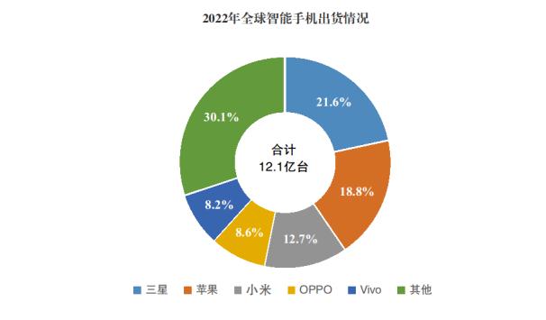 據相關機構統計,2022年全球智能手機出貨量為12.1億臺,同比下降11.3%,出貨量前五家企業市場占有率總和為69.9%。其中,小米出貨量為1.5億臺,同比下降19.8%,市場占有率為12.7%;OPPO出貨量為1.0億臺,同比下降22.7%,市場占有率為8.6%;Vivo出貨量為1.0億臺,同比下降22.8%,市場占有率為8.2%。