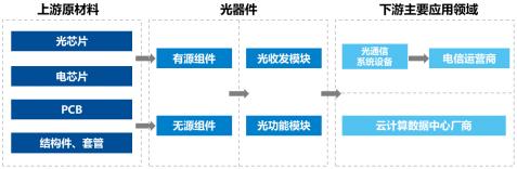 從光芯片產業鏈角度看,光芯片與其他基礎構件(電芯片、結構件、輔料等)構成光通信產業上游,產業中游為光器件,包括光組件與光模塊,產業下游組裝成系統設備,最終應用于電信市場,如光纖接入、4G/5G移動通信網絡,云計算、互聯網廠商數據中心等領域。