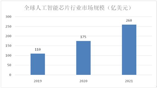 2021年全球AI芯片市場規模約為260億美元。隨著人工智能技術日趨成熟,數字化基礎設施不斷完善,人工智能商業化應用將加速落地,推動AI芯片市場高速增長。