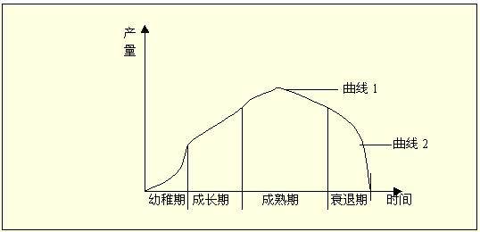 行業的生命周期曲線忽略了具體的產品型號、質量、規格等差異,僅僅從整個行業的角度考慮問題。行業生命周期可以從成熟期劃為成熟前期和成熟后期。在成熟前期,幾乎所有行業都具有類似S形的生長曲線,而在成熟后期則大致分為兩種類型:第一種類型是行業長期處于成熟期,從而形成穩定型的行業,如圖中右上方的曲線1;第二種類型是行業較快的 衰退期,從而形成迅速衰退的行業,如圖中的曲線2。行業生命周期是一種定性的理論,行業生命周期曲線是一條近似的假設曲線。