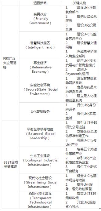 (2)成熟期(計劃實施第二個五年)。將U-City建設模式向國外推廣。本階段重點任務為擴散U化服務,除將U化服務應用于各個產業外,將U化服務推廣至海外市場,成為IT服務出口產品更是本階段核心任務。另外,將相關電子對象嵌入智能芯片、生物科技與納米科技IT技術的活用、穩定U化社會文化亦為此階段發展要項。