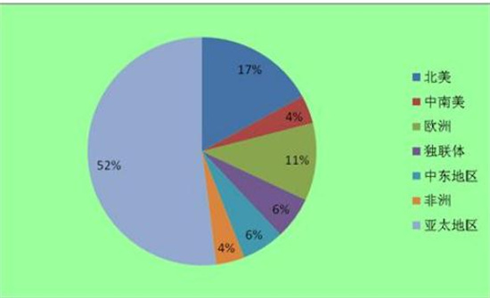其中亞太地區碳排放量占比為52%,其次分別為北美、中南美、歐洲,碳排放量占比分別為17%、4%、11%。