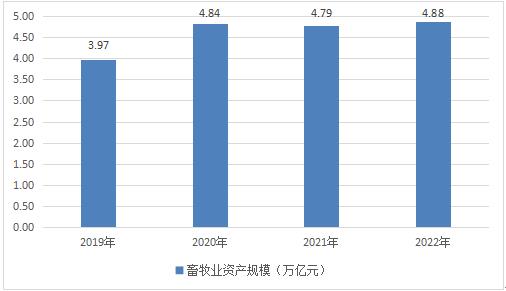 2019年中國畜牧業資產規模為3.97萬億元,至2022年,中國畜牧業資產規模為4.88萬億元。