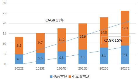 2022-2027年,隨著我國居民的可支配收入增加,繼而對優質醫療服務的需求增加,而公立醫院因受政府監管而無法提供具競爭力的服務。例如,根據《國務院辦公廳關于城市公立醫院綜合改革試點的指導意見》,公立醫院特需醫療服務的比例不得超過全部醫療服務的10%。相比而言,私立醫院在服務定制和定價方面更加寬松。未來隨著行業進一步得到發展,預計2022-2027年我國民營兒科醫院行業將以13%的年復合增長率保持較快增長,預計至2027年我國民營兒科醫院行業中高端市場規模有望增長至為17.1億元,低端市場有望增長至9.1億元。