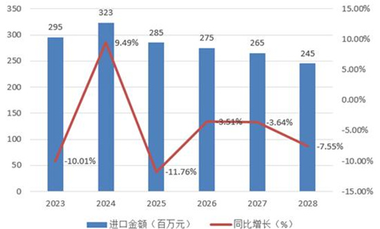 隨著2022年底的疫情宣告結束,2023年以后旋挖鉆機市場進口將會有所上升,但由于目前國內工程機械制造水平已達較高水準,進口幅度將不會產生較大改變,且可能保持下降趨勢。預計2028年旋挖鉆機市場進口金額為245百萬元,同比增長-7.55%。