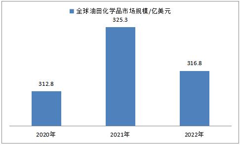 油田化學品是20世紀70年代以來隨著工業的發展而逐步形成的一類新領域精細化工產品,涉及鉆完井、儲層改造、采油、油氣集輸、油田水處理等油氣勘探開發所有環節。油田助劑是保障油氣勘探開發正常進行的必備材料,研發、生產高性能油田助劑對于推動石油工業高質量發展意義重大。隨著油氣行業擴張、勘探生產活動增加以及鉆井技術的進步,推動了油田化學品市場近年來的持續增長,2022年全球油田化學品市場價值316.8億美元,同比上年減少2.61%,主要受全球疫情和復雜的地緣糾紛影響。