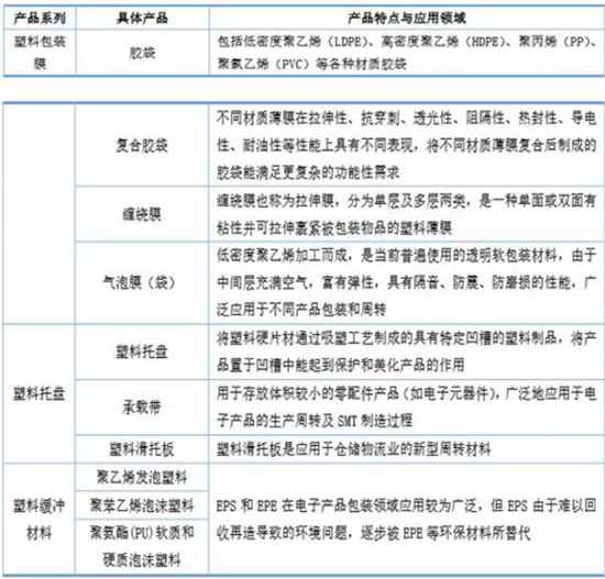 從包材類別及應(yīng)用領(lǐng)域劃分,電子產(chǎn)品塑料包裝材料主要包括塑料包裝膜、塑料托盤和塑料緩沖材料三大系列產(chǎn)品: