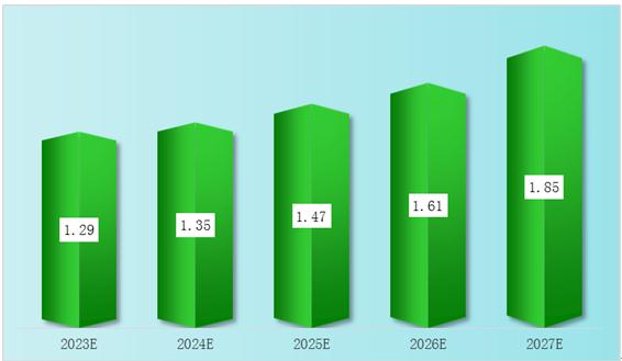 圖表:2023-2027年我國工程質量檢測出具報告供給預測(單位:億份)