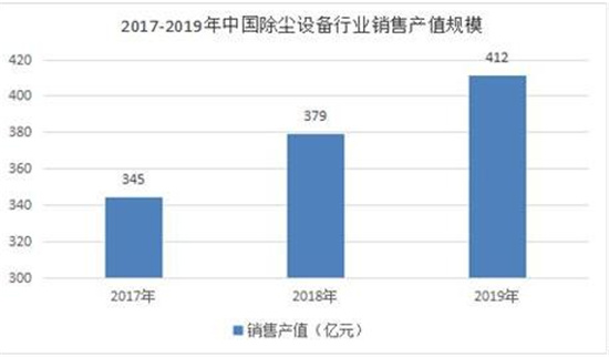 據數據顯示,2017年中國除塵設備行業銷售產值規模為345億元,2018年中國除塵設備行業銷售產值規模為379億元,2019年中國除塵設備行業銷售產值規模為412億元,同比增速為8.47%。