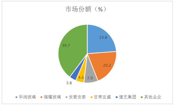 我國平板玻璃市場份額前五家企業分別為華潤玻璃、福耀玻璃、安徽安泰、甘肅亞盛、建藝集團,市場份額分別為23.8%、20.2%、7.9%、4.6%和3.8%左右。