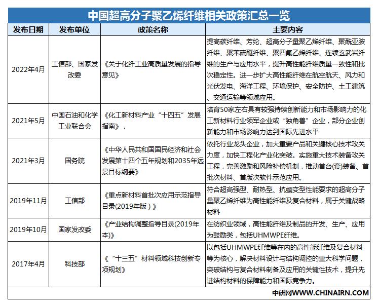 近年來,中國超高分子量聚乙烯纖維行業在各級政府的高度重視和國家產業政策的重點支持下,得到了快速發展。國家陸續出臺了一系列政策,鼓勵超高分子量聚乙烯纖維行業的發展與創新,如《關于化纖工業高質量發展的指導意見》、《化工新材料產業“十四五”發展指南》以及《中華人民共和國國民經濟和社會發展第十四個五年規劃和2035年遠景目標綱要》等產業政策,為超高分子量聚乙烯纖維行業的發展提供了明確、廣闊的市場前景,為企業提供了良好的生產經營環境。