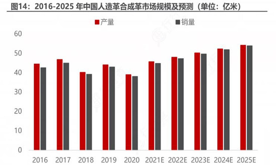 未來隨著國內(nèi)紡絲實力的整體提升,預(yù)計2025年中國人造革合成革產(chǎn)量和銷量分別將達到54.2億米、53.9億米,2020-2025年期間的CAGR達到6.80%和7.18%。