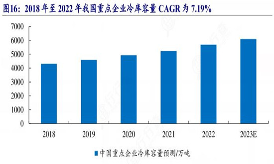 根據中冷聯盟《2022全國冷鏈物流企業分布圖》,2018年至2022年我國重點企業冷庫容量從4,307萬噸增長至5,686萬噸,CAGR為7.19%。隨著冷鏈基礎設施政策的引導和企業布局完善,預計2023年我國重點企業冷庫容量將達到6,095萬噸。