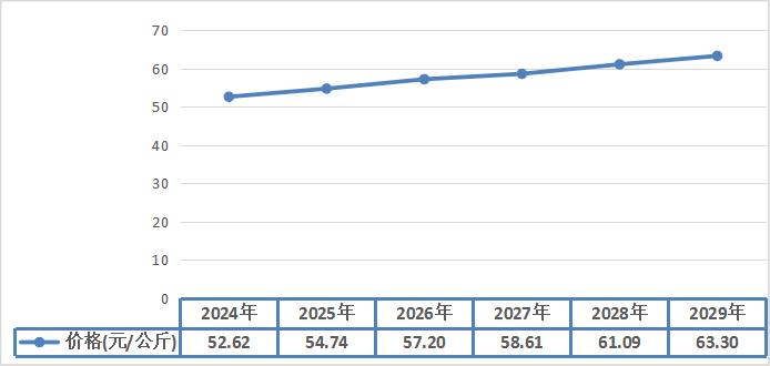 隨著種植技術的不斷發展和提高,串番茄的產量和品質得到提高,同時隨著串番茄的營養價值得到更多的認知,未來串番茄價格走勢呈上漲趨勢,預計2029年每公斤串番茄價格達到63.30元。