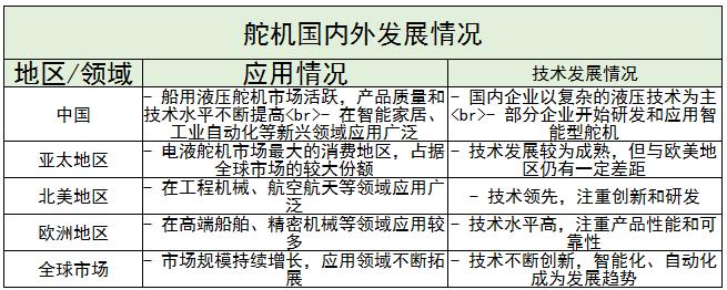 在技術進步方面,國內企業在舵機技術上的發展雖然與國外企業仍存在一定差距,但正在逐步縮小。國內企業主要以復雜的液壓技術為主,而國外企業則更多采用先進的電子技術。不過,國內企業也在積極創新,一些企業已經開始在智能型舵機等領域進行研發和應用,以滿足船舶操縱系統智能化操縱的需求。
