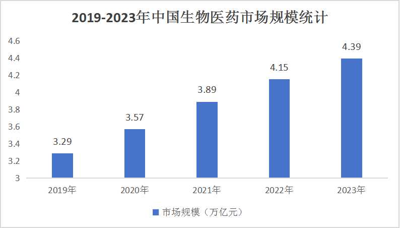 據(jù)中研普華產(chǎn)業(yè)院發(fā)布的《2024-2029年中國生物醫(yī)藥行業(yè)市場深度調(diào)研與投資價值研究報告》數(shù)據(jù)顯示,從市場規(guī)模來看,中國生物醫(yī)藥行業(yè)市場呈現(xiàn)出快速增長的趨勢。2019年,我國生物醫(yī)藥行業(yè)市場規(guī)模為3.29萬億元,2021年達到3.89萬億元,而到了2023年,這一數(shù)字已經(jīng)增長到4.39萬億元。2020年以來,受新冠疫情影響,生物醫(yī)藥市場需求激增,推動了市場規(guī)模的快速增長。
