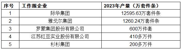 2023年,經過統計,中國工作服行業中際華集團服裝產量最多,達到12595.63萬套件條,其次是雅戈爾集團,服裝產量達到1260.24萬套件條。