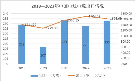 我國電線電纜的出口量在全球市場中占有相當大的份額,出口量逐年增長,東南亞、中東、非洲、歐洲等地區是主要出口市場。2023年我國電線電纜出口量233萬噸,同比增長2.8%。從金額方面來看,2023年我國電線電纜出口金額1626.65億元,同比下降3.2%。