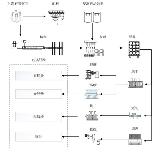 坩堝拉絲法:工藝復(fù)雜,先把玻璃原料高溫熔制成玻璃球,然后將玻璃球二次熔化,高速拉絲制成玻璃纖維原絲。