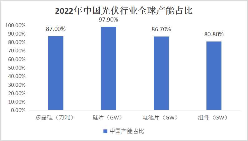 中國光伏龍頭企業憑借著晶硅技術及成本控制方面的優勢,低成本先進產能持續釋放。根據中國光伏行業協會數據,2022年,全球多晶硅產能134.1萬噸,中國產能占比87.0%;全球硅片、電池片、組件產能分別為664GW、583.1GW和682.7GW,中國產量占比分別為97.9%、86.7%和80.8%。全球多晶硅產量100.1萬噸,中國產量占比85.6%;全球硅片、電池片、組件產量分別為381.1GW、366.1GW和347.4GW,中國產量占比分別為97.4%、90.3%和84.8%。
