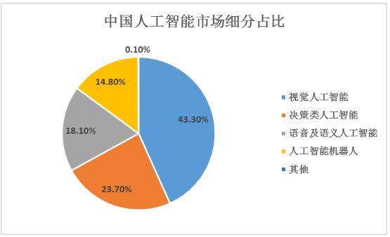 按照應用領域,我國人工智能可分為決策類人工智能、視覺人工智能、語音及語義人工智能和人工智能機器人。其中,視覺人工智能市場占比最高,達43.3%;決策類人工智能、語音及語義人工智能、人工智能機器人,占比分別為23.7%、18.1%、14.8%。