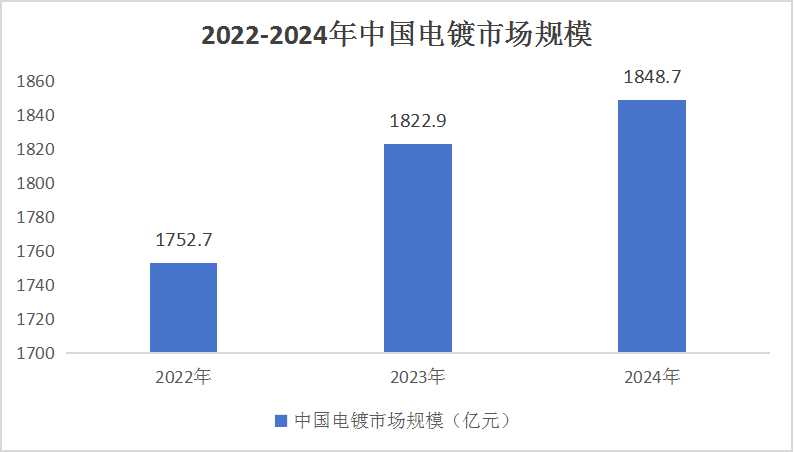中國作為全球電鍍市場的重要組成部分,其市場規(guī)模持續(xù)擴(kuò)大,并保持穩(wěn)健增長的趨勢。根據(jù)中研產(chǎn)業(yè)研究院發(fā)布的《2024-2029年中國電鍍工業(yè)園區(qū)行業(yè)發(fā)展分析與前景展望研究報告》,2022年中國電鍍市場規(guī)模達(dá)1752.7億元,同比增長4.23%,2023年則增長至約1822.9億元,預(yù)計2024年市場規(guī)模將達(dá)1848.7億元。