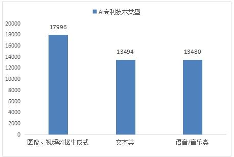 從分類(lèi)來(lái)看,圖像和視頻數(shù)據(jù)類(lèi)在生成式人工智能相關(guān)專(zhuān)利中居首位(17996項(xiàng)),文本和語(yǔ)音/音樂(lè)類(lèi)分居二三位(文本13494項(xiàng)、語(yǔ)音/音樂(lè)13480項(xiàng))。
