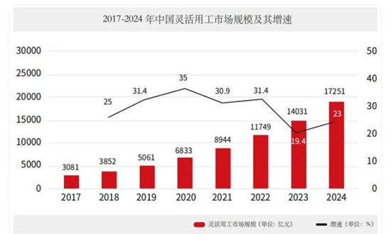 靈活用工包括勞務派遣、外包、眾包、兼職、平臺用工、自雇、退休返聘等多種形式。隨著企業對靈活用工模式的認可度提高,越來越多的企業開始將靈活用工作為優化人力資源配置的重要手段。特別是在第三產業服務業中,由于其用人需求存在波峰波谷現象且技能門檻不高,靈活用工的需求更為強烈。數據顯示,2017-2024年我國靈活用工市場規模由3081億元增長到17251億元,7年平均增速26.6%。