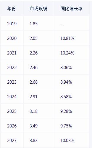 表1 2019-2027年中國硫辛酸市場規(guī)模及預(yù)測(單位:億元)