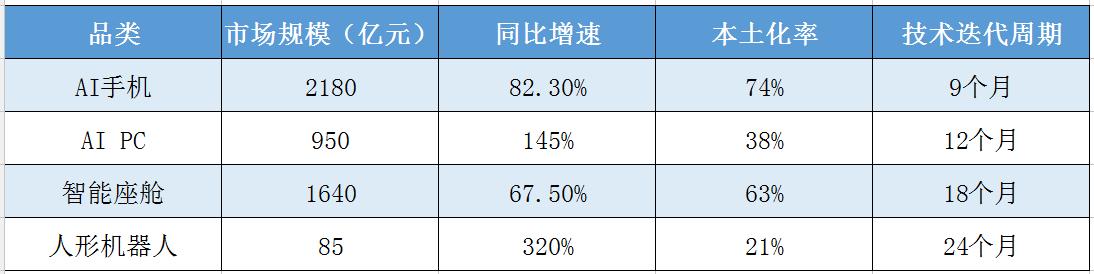數(shù)據(jù)揭示三大趨勢:①搭載NPU算力超過30TOPS的AI手機(jī)出貨量占比達(dá)19%;②支持本地大模型的PC產(chǎn)品均價較傳統(tǒng)機(jī)型高47%;③汽車智能座艙芯片國產(chǎn)化率突破50%。
