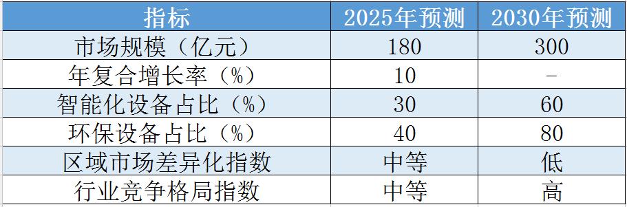 (注:表中數(shù)據(jù)為預(yù)測值,實際數(shù)據(jù)可能因市場波動、政策調(diào)整等因素有所變化。智能化設(shè)備占比和環(huán)保設(shè)備占比是基于市場發(fā)展趨勢的預(yù)測,具體數(shù)值可能因技術(shù)進步和政策導(dǎo)向而有所調(diào)整。)