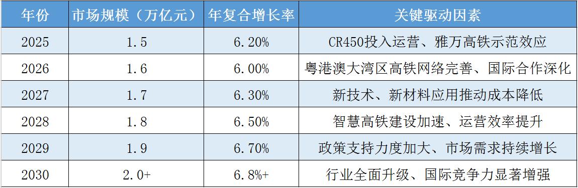 據中研普華產業研究院《2025-2030年中國高速鐵路建設行業市場深度調研及投資戰略規劃研究報告》預測,2025年中國高速鐵路建設行業市場規模將達到1.5萬億元人民幣,年復合增長率保持在6%以上。到2030年,市場規模有望突破2萬億元大關。以下是未來五年市場規模的預測表格:
