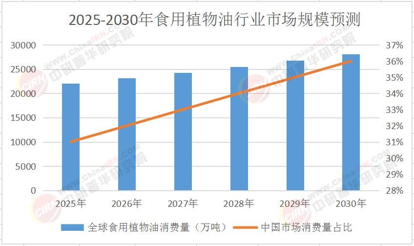 中研普華《2025-2030年食用植物油行業(yè)供需趨勢及投資風(fēng)險研究報告》數(shù)據(jù)顯示,2024年全球食用植物油消費量達(dá)到2.1億噸,同比增長3.5%。其中,中國市場消費量占比超過30%,成為全球最大的食用植物油消費國。預(yù)計到2030年,全球食用植物油消費量將達(dá)到2.5億噸,年均增長率保持在5%左右。